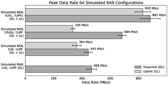 In the single-UE test with downlink TCP (Transmission Control Protocol) traffic with a single UPF, the maximum downlink throughput reached 468 Mb/s. Introducing uplink traffic reduced the downlink rate to 345 Mb/s, while uplink throughput reached 364 Mb/s. To further simulate real-world scenarios where multiple IoT devices are connected, tests with 10 simulated UEs connected to a single UPF were conducted. Each UE was configured with 50 Mb/s uplink and 100 Mb/s downlink TCP traffic. The peak downlink and uplink data rates in this test were 684 Mb/s and 336 Mb/s, respectively, as shown in Figure 4.