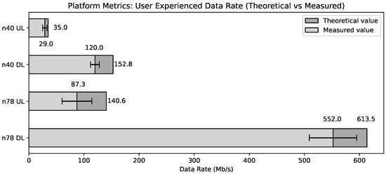 These tests, as shown in Table 2 and represented graphically in Figure 5, saw a maximum downlink of 552 Mb/s and uplink of 87.3 Mb/s for the n78 indoor band, while the n40 outdoor band achieved a downlink of 120 Mb/s and an uplink of 29 Mb/s. These measured values, being close to the theoretical limits, demonstrate the platform’s robust performance under real-world conditions, effectively handling network constraints and channel variability with minimal deviation from ideal calculations.