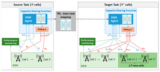 This section proposes using TRL to accelerate the re-training process of the DQN-MARL solution when extending the number of cells in a RAN infrastructure. The proposed TRL approach, which is depicted in Figure 1, considers as a source task the policy π for capacity sharing in a scenario with N cells and as a target task the policy π′ for the case of N′ = N + ΔN cells, where both policies π and π′ rely on the DQN-MARL capacity sharing solution in [11]. In the source task, a DQN agent iteratively interacts with the RAN environment of N cells to learn the policy π. In each step of this training process, the DQN agent obtains the state of the environment, which is provided by the performance monitoring module. The agent then selects the most appropriate action according to the current policy π available at the DQN agent, and this action is applied to the environment. In the following step, the DQN agent receives a reward from the performance monitoring module. This reward assesses the suitability of the previous action and is used by the DQN agent to update the policy π. This process is repeated until a certain termination condition is reached. In the case of the target task, the training process of policy π′ is sped up by leveraging the previous knowledge gained during the training process of policy π. In this case, the knowledge from policy π is first transferred to policy π′, and then policy π′ is refined through the interaction of the DQN agent with the new environment consisting of N′ cells, as described for the source task. This knowledge transfer occurs according to the state, action, and reward definitions of the RL agents in the source and target tasks, which are formulated in Section 3.1, and follows a specific TRL technique referred to as inter-task mapping, which is described in Section 3.2.