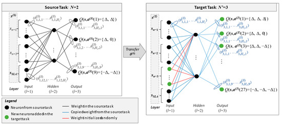 The state and action definitions for the source and target tasks differ in the number of components. Specifically, the state and action definitions in the target task incorporate the components sΔN and aΔN(d), respectively, with respect to the source task definitions, while the rest of the components are common. Based on this, only a partial mapping can be defined between the states/actions in the source and target tasks, because sΔN and aΔN(d) in the target task cannot be mapped to any component in the source task. This introduces a special requirement when selecting the TRL approach, as the majority of TRL solutions require a full mapping between the state, action, and reward components in both tasks. Considering this requirement, the TRL approach selected here is based on the transfer via inter-task mapping for policy search methods (TVITM-PS) in [25], which proposes a methodology that supports partial mappings between states and actions when transferring the weights of the ANN that represents the policy in the source task to build the ANN for the policy in the target task.
