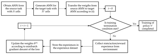 Figure 3 summarizes the overall process for obtaining the policy of a DQN agent in the target task following the proposed TRL approach. After obtaining the ANN from the source task, the ANN for the target task is generated considering the number of input neurons as the number of components in s(T), the same number of hidden layers and hidden nodes as in the source ANN, and 3N′ neurons in the output layer. Then, the weights θ(S) are transferred to θ(T) according to (4). Next, an iterative process begins where the ANN in the target task is trained using the DQN algorithm to update and tune the weights θ(T). In each training step t, the DQN algorithm starts by collecting the state/action/reward experiences from the new RAN environment with N′ cells, which are stored in the experience dataset of the DQN agent. Then, the algorithm updates the weights according to the mini-batch gradient descent of the loss. This is repeated until a training termination condition is met, obtaining policy π′ as a result. The termination condition can be expressed in different ways, such as reaching a maximum number of training steps or achieving the convergence of a given metric. For further details on the training operation of the considered RL-based capacity sharing solution, the reader is referred to [11].