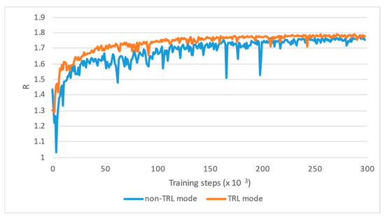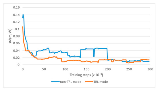 Figure 4 shows the evolution of the average aggregated reward per evaluation, R, during the training of the policies for N′ = 5 cells with the TRL and Non-TRL modes. For both cases, the value of R increases abruptly at the beginning of the training and then stabilizes to a value of around 1.78. However, the value of R increases faster with the TRL mode than with the Non-TRL mode. Moreover, while R exhibits high fluctuations from the beginning until approximately 200 × 103 training steps with the Non-TRL mode, these fluctuations are much smaller with the TRL mode throughout the training. These results indicate that the proposed TRL approach allows for achieving a higher and more stable reward sooner during the training, thus reducing the training duration. To further assess the convergence of the policies obtained for TRL and Non-TRL modes, Figure 5 shows the standard deviation of R, std(m,W), when considering a window of W = 30 × 103 training steps. In contrast to the evolution of R, the value of std(m,W) decreases abruptly at the beginning of the training for both modes. After this initial decrease, the value of std(m,W) decreases slowly until stabilizing. Higher standard deviation values are obtained with the Non-TRL mode due to the larger reward fluctuations that were observed in Figure 5. Accordingly, the standard deviation values for the TRL mode decrease and stabilize much sooner, evidencing that the proposed TRL approach accelerates the training process. In fact, considering that convergence is achieved when the standard deviation std(m,W) is lower than stdth = 0.01, the training duration for the Non-TRL mode is 265 × 103 training steps, while for the TRL mode it is 123 × 103 training steps. This means that the use of the proposed TRL approach reduces the training duration by 54%.