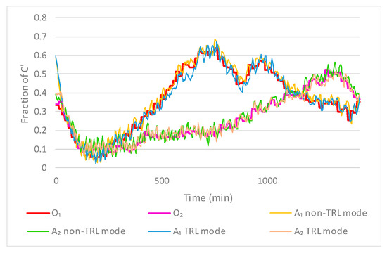 For the case of the N′ = 5 cells, the policies obtained after convergence as a result of the TRL and Non-TRL modes have been applied to the offered loads of both tenants. Figure 7 shows the assigned capacity to each tenant in the cell, denoted as A1 and A2 for tenants 1 and 2, respectively, by the policies obtained with each re-training mode against the offered loads of each of the tenants in the cell. The results show that the policies obtained with both re-training modes execute a similar capacity assignment in which the offered loads are satisfied during most of the day without overprovisioning. In fact, the SLA satisfaction ratio, computed as the average ratio between the throughput of a tenant and the minimum of SAGBRk and the tenant’s offered load, is 96% for the policy trained with the Non-TRL mode and 95% with the TRL mode, reflecting very similar performance. These results reveal that the behavior of the policies trained with the proposed TRL approach is similar to the one obtained without TRL but with the benefit of a much smaller training duration.