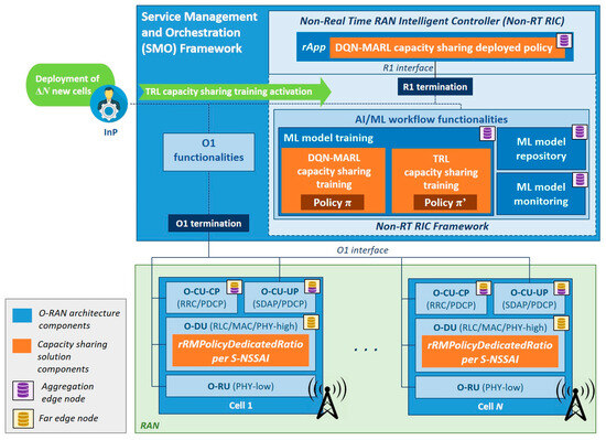 The proposed TRL approach for capacity sharing in this paper is included in the ML model training in Figure 8. Once the InP decides to deploy new cells in the RAN, it can activate the TRL capacity sharing training functionality, specifying the value of ΔN. This functionality will use the knowledge gained from a previously learned policy π, which can be obtained from the ML model repository, to learn the new policy π′. When the training of π′ is completed, this policy can be deployed in the rApp through the R1 interface, replacing the old policy π.