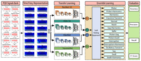 - We propose an ensemble classification framework based on transfer learning with DCNN models to classify PQDs using time–frequency images. The framework includes four pre-trained DCNN models, ResNet-50, VGG-16, AlexNet, and SqueezeNet, which were selected after rigorous experimental evaluation. We evaluate their performance across a spectrum of sixteen different PQD classes.