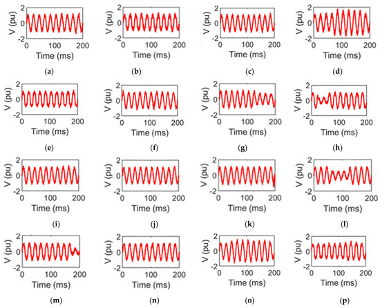 An example of PQDs with 20 dB noise: (a) flicker; (b) flicker + harmonics; (c) flicker + sag; (d) flicker + swell; (e) harmonics; (f) impulsive transient; (g) interruption; (h) interruption + harmonics; (i) normal; (j) notch; (k) oscillatory transient; (l) sag; (m) sag + harmonics; (n) spike; (o) swell; and (p) swell + harmonics.