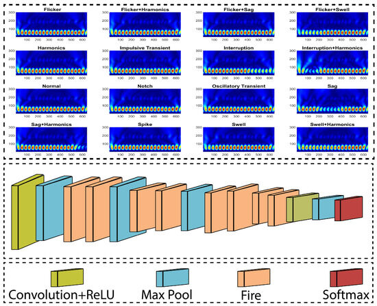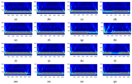 An example of a time–frequency representation of PQDs with 20 dB noise: (a) flicker; (b) flicker + harmonics; (c) flicker + sag; (d) flicker + swell; (e) harmonics; (f) impulsive transient; (g) interruption; (h) interruption + harmonics; (i) normal; (j) notch; (k) oscillatory transient; (l) sag; (m) sag + harmonics; (n) spike; (o) swell; (p) swell + harmonics.