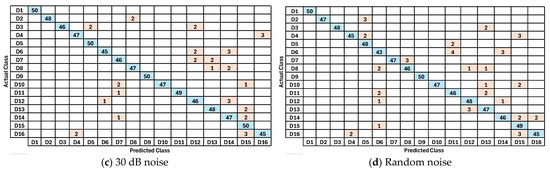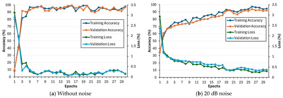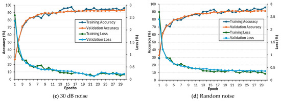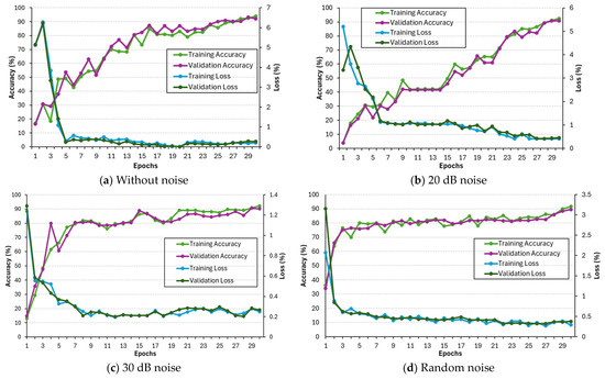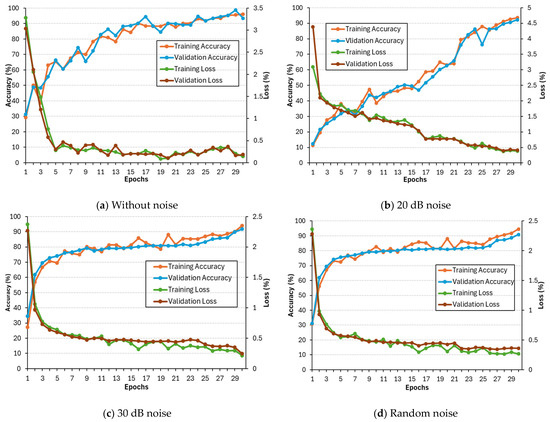 The training performance of VGG-16 for 30 epochs, with and without noise, is shown in Figure 11. Without the noise dataset, VGG-16 achieved maximum training and validation accuracies of 96.20% and 93.50%, respectively, with 0.140% training and 0.190% validation losses. For 20 dB noise, the training and validation accuracies decreased to 93.50% and 92.30%, respectively. The confusion matrices for the noise and noiseless datasets are shown in Figure 12, which demonstrate that 99.48% is the highest testing accuracy achieved for the noiseless dataset followed by 99.39% for 30 dB noise, 99.25% for random noise and 99.13% for 25 dB noise. Furthermore, for the VGG-16 model, the precision, recall, and F1-score are also calculated. The results indicate that VGG-16 achieves superior performance on the noiseless test dataset, with (1) an average value of accuracy (99.48%), (2) precision (96.17%), (3) recall (95.88%), and (4) F1-score (95.90%), whereas the lowest performance is recorded with the 20 dB noise test dataset with the following average values: (1) accuracy (99.13%), (2) precision (93.50%), (3) recall (93%), and (4) F1-score (93.07%), as shown in Table 4.
