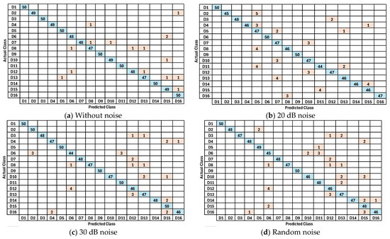 It is observed that under no noise conditions, the ResNet-50 achieved a maximum training and validation accuracy of 98.01% and 97.14%, respectively, with 0.133% training and 0.158% validation losses. Its performance degraded under noisy conditions, and for 20 dB noise, the training and validation accuracies decreased to 94.38% and 91.79%, respectively. The confusion matrices for noisy and noiseless datasets are illustrated in Figure 10, which demonstrates that the classification accuracy is relatively high for noiseless testing datasets as compared to other noisy datasets. The diagonal entries of the confusion matrix represent the true classification of testing instances, while the off-diagonal entries depict the misclassification of these samples. Additionally, accuracy, precision, recall, and F1-score were computed using Equations (4)–(7). The results indicate that ResNet-50 achieves superior performance on noiseless datasets, with an average value of accuracy (99.75%), precision (98.04%), recall (98%), and F1-score (98%), whereas with noisy test datasets, its performance decreases, resulting in an average value of accuracy (99.25%), precision (94.55%), recall (94%), and F1-score (94.13%) with 20 dB noise as shown in Table 4.