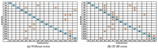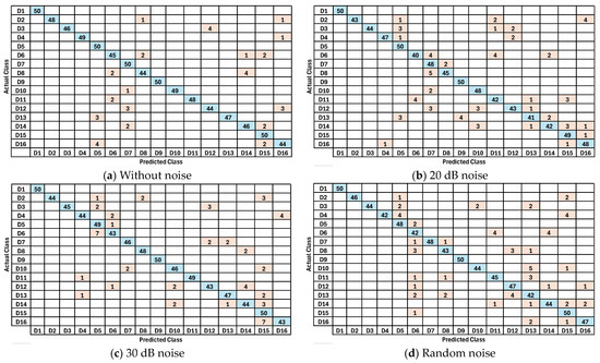 The performance trend of AlexNet is in line with the ResNet-50 and VGG-16 models. It obtained maximum training and validation accuracies of 93.92% and 92.19%, respectively, with 0.205% training and 0.269%, validation losses. The training and validation accuracies decreased to 92.50% and 90.938%, respectively, for 20 dB noise. The confusion matrices for noisy and noiseless datasets are illustrated in Figure 14. The test accuracy is relatively high for noiseless datasets as compared to other noisy datasets. Moreover, the performance matrices including accuracy, precision, recall, and F1-score are given in Table 4. The results specify that AlexNet attains the highest performance for the noiseless test dataset, giving an average value of accuracy (99.38%), precision (95.21%), recall (95%), and F1-score (95.01%). In the case of noisy test datasets, it produces the lowest average results of accuracy (99.91%), precision (91.73%), recall (91.25%), and F1-score (91.23%) with 20 dB noise, as shown in Table 4.