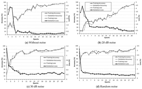 The training performance of AlexNet for 30 epochs, with and without noisy datasets, is shown in Figure 13.