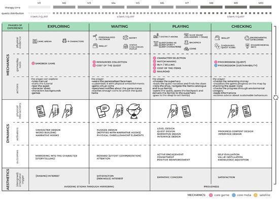 First, the design team formulated a clear problem statement to be addressed through the game-based intervention, alongside the desired outcomes. This step ensured that all game elements remained consistent with the therapeutic objectives. The next step focused on aesthetics, which refers to the emotional engagement of players and their reactions to the gaming experience. Once the aesthetic strategy was established, the designers considered the game’s dynamics.