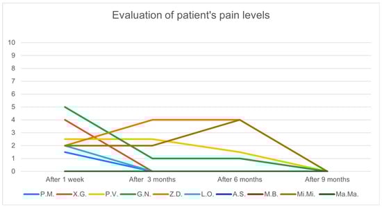 The results showed that the levels of pain reported by the patients generally decreased over time. Patient Z.D. noticed an increase in pain at month three. This was mainly due to discomfort in some lower teeth and a slight skin irritation. However, the sense of discomfort disappeared in the following months, and the child declared that they were highly satisfied with the new facemask. Indeed, the already high level of satisfaction increased after 6 and 9 months, and the child wore the mask continuously for 9 h a day as prescribed (