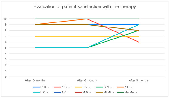Overall, the patients declared being satisfied with the therapy: patient satisfaction throughout the treatment consistently averaged above 7.8 on a VAS ranging from 0 to 10, with a maximum value of 8.7 recorded at the end of therapy (