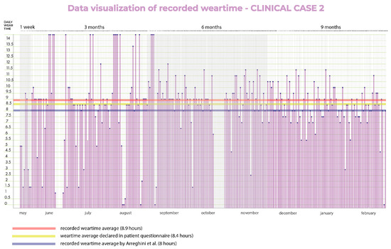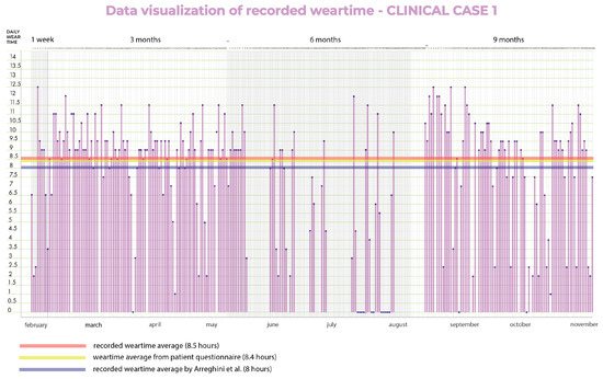 To fully understand the data visualisation, key components of the graph include: purple vertical bars, which represent daily recorded wear times, indicating variations in the usage of the facemask throughout the therapy period, and coloured horizontal lines, which denote the recorded wear time average detected by the sensors integrated in the facemasks (yellow line), the wear time declared in the patient questionnaire (red line), and the benchmark set by the previous study of Arreghini et al. [