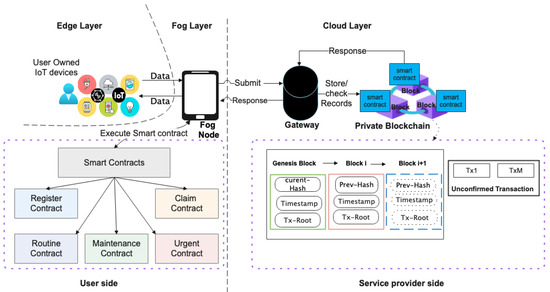 - Fog layer—smart contracts are the only means to communicate with blockchain networks. We define multiple smart contracts according to the user’s preferences and purposes to preserve their privacy. Thus, the application within the fog device triggers the appropriate smart contracts and establishes a private, secure channel when handling sensitive data. Further details about smart contracts and their management are depicted in Section 3.2.