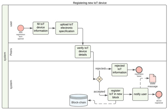 - Register smart contract enables the user to register new IoT devices. The user fills out the registration form and uploads the electronic specification of the new IoT device. Then, the blockchain peers verify the correctness of the IoT details according to the electronic specifications. Thereafter, the system shall register the IoT device on a new block once it is successfully verified by the peers. Finally, the system notifies the user about the registration process. Figure 2 depicts the different steps of the registration process.The blockchain gateway is responsible for providing secure communication between the user application and the blockchain network through asymmetric encryption. Hyperledger Fabric provides authentication, encryption, and access control to the blockchain network.