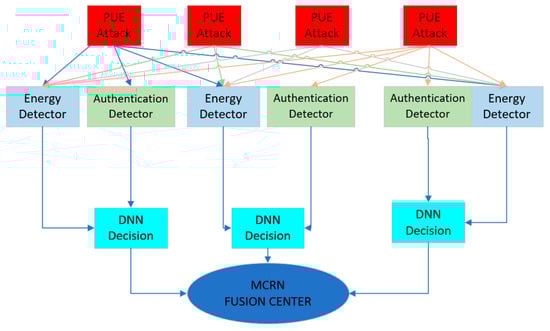 - Aygul, M.A.; Furqan, H.M.; Nazzal, M.; Arslan, H. Deep Learning-Assisted Detection of PUE and Jamming Attacks in Cognitive Radio Systems. In Proceedings of the 2020 IEEE 92nd Vehicular Technology Conference (VTC2020-Fall), Virtual, 18 November–16 December 2020; IEEE: Piscataway Township, NJ, USA; pp. 1–5. [Google Scholar]