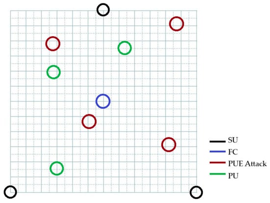 As can be seen in Figure 1, a Primary Base Station (PBS) communicates with the PUs, and the cognitive base station (CBS) communicates with the SUs when a PU frequency is not used. If a PU appears, the system must release the channel. The PUE attack mimics the PU information and behavior, and the CBS and SUs recognize it as an authentic PU and release the channel.