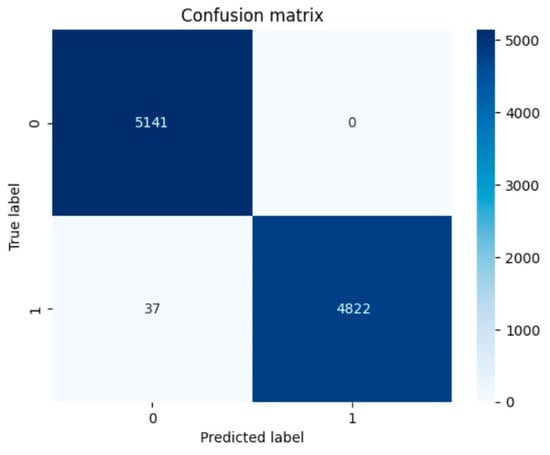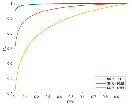 SNR levels range from −25 dB to 0 dB. The algorithm achieves a detection probability and accuracy of 90% at −9 dB SNR. The confusion matrix of the trained algorithm uses 10,000 samples, as seen in Figure 14.