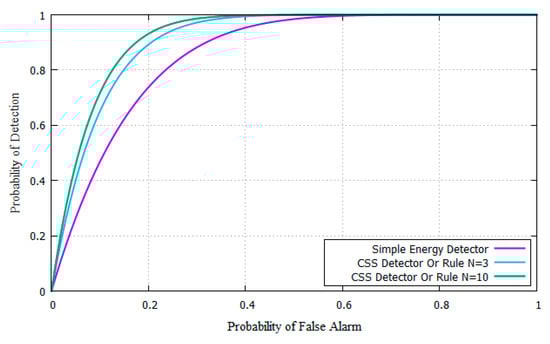 As expected from the literature, the CSS has better results than individual detection. Increasing the number of SUs transmitting the detector results to the FC also increases the PD for the assigned PFA = 0.01.