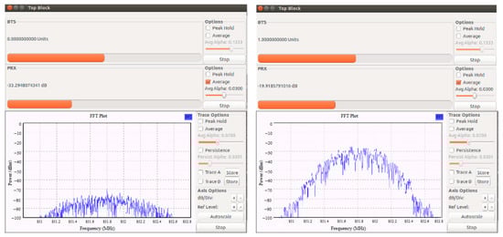 The results of the uplink power measurement can be seen in Figure 12, where the spectrum measurement without power and with power in the uplink channel is shown.