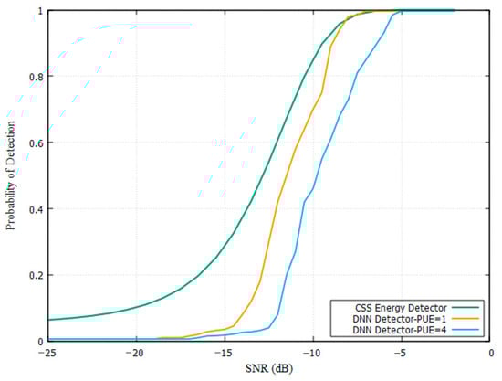 The probability of detecting a PUE attack is calculated as the number of correct PUE detections to the total instances in which a PUE is present. Experiments are carried out with one and four PUE attacks active on an SDR simultaneously at different work frequency ranges. The samples are taken from each dB in increments of −25 dB to 0 dB, with the results illustrated in Figure 17. The receiver operation curves (ROC) for the probability of detection for a CSS energy detector based on [26] are compared with the DNN experimental results for a single and four PUE attacks.