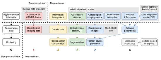 - Case 3 (green)—AI-based home monitoring of eye diseases. Regularly obtaining OCT images of the eye can improve the diagnosis and rehabilitation recommendations made by medicinal professionals. The OCT devices provided to patients at home help in obtaining these images and strongly improve patient acceptance, while the automatic segmentation provided by a commercial application for medical professionals further assists in making treatment decisions. The employed data are personal and biometric, and their usage requires individual patient consent when using the OCT device and sending the data to be segmented. At the same time, the segmentation process itself may be improved further using these data or is itself based upon other personal patient data, which in turn will need and would have needed individual patient consent for this type of usage.