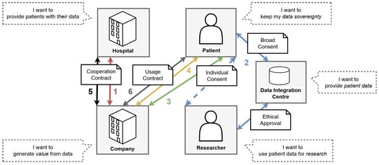 Acting upon these intentions requires the involved stakeholders to enter into certain agreements, so that their interactions respect the data protection rights of all parties involved. These agreements range from cooperation contracts between institutions like hospitals and companies, to usage contracts with patients as the user of a company’s offering, to consent management agreements between patients, researchers, and data integration centers.