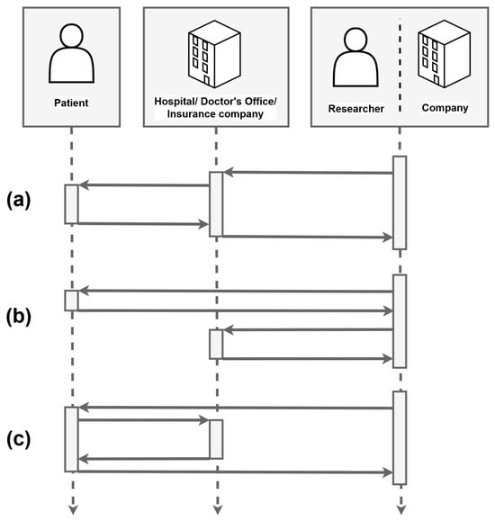 In the very common Figure 4a, a researcher or company obtains patient data stored in hospital or doctor’s office information systems, despite patients providing certain medically relevant information only directly, via wearables or questionnaires. Supporting this flow, DICs provide anonymized routine data of multiple patients after ethical approval by the associated hospital of the requester’s stated purpose, which has to be for research. Patients enable DICs to do this by compromising on their data sovereignty via a broad consent agreement. For patients unwilling to compromise, the hospitals and doctor’s offices effectively engage in consent management, acting as custodians of patient data and asking patients directly before sending any data. Forwarding each data request to all previous patients seems organizationally infeasible, given that contacting patients for routine checkups already poses challenges to many medical professionals. Furthermore, interested researchers or companies will have to contact many institutions to form a coherent dataset, since individual patients can visit many hospitals and doctor’s offices, change insurance companies, move cities, etc.