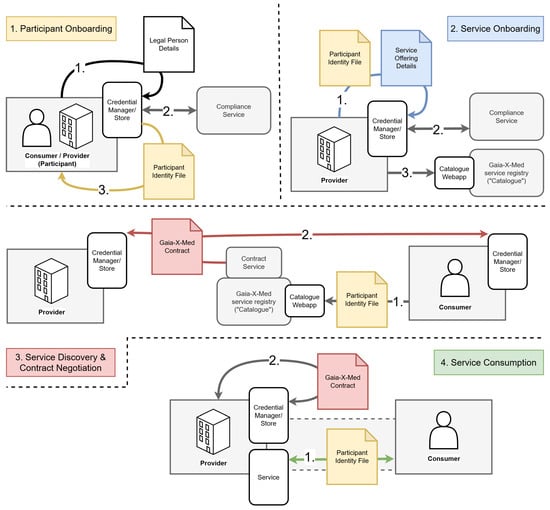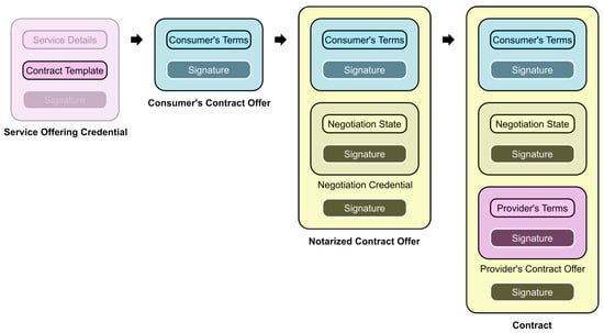 A Gaia-X-Med Contract passes through four steps, as shown in Figure 9. The content of a Contract comprises two parts; first, a static, free-form (non-machine readable) non-negotiable text part which the Consumer has to agree to. The other part is defined through the Contract Template, which is a JSON Schema (https://json-schema.org/ (accessed on 5 December 2024)) object embedded inside a Service Offering’s Credential. Through the Contract Template, a Provider can offer configurable parameters for the Service to the Consumer, which allows them to negotiate certain aspects of the Contract. For example, a web hosting service could have a configurable amount of data storage.