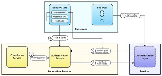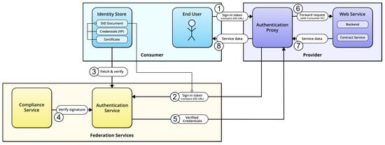 The Gaia-X-Med implementation simplifies this process with a federation-wide Authentication Service. This service validates login tokens, verifies compliance, and returns trustworthy Credentials, sparing Providers from implementing the entire verification process independently. Figure 6 shows a simplified overview of the process.