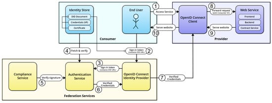 To realize this, an OpenID Connect Identity Provider based on node-oidc-provider (https://github.com/panva/node-oidc-provider (accessed on 5 December 2024)) was developed and hosted as a federation-wide web application. After asking the user for their Participant Identity File and decryption passphrase, the application generates a Login token client-side that is then sent to the Authentication Service. The returned Participant Credential is mapped to the corresponding OAuth2 claims, which are finally forwarded to the Provider Service.