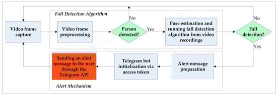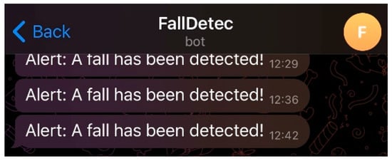 The system was designed to capture video streams from a camera and process these images to detect human poses and identify potential falls. Upon detecting a fall, it sends an alert via a Telegram bot [57] to promptly inform caregivers or family members when a fall is detected, ensuring timely intervention.