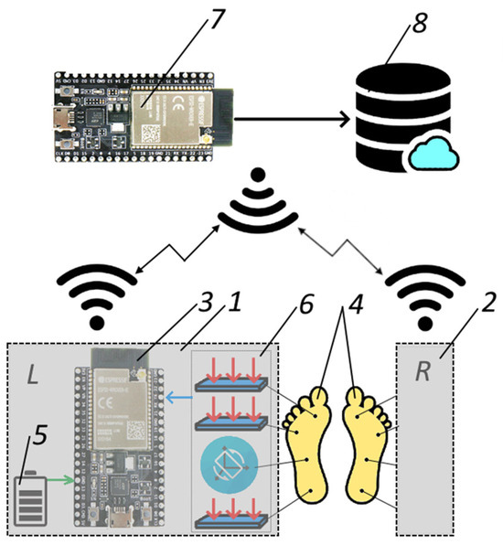 Experimental setup of the human-gait analysis: 1—left-foot data module set; 2—right-foot data module set; 3—slave microcontroller; 4—position of the sensors on the feet; 5—battery; 6—array of pressure sensors and accelerometer; 7—main data master microcontroller; 8—data storage.