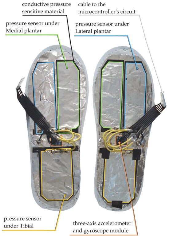 In the practical experiment carried out, a setup with insoles for both the left and right feet, each embedded with three pressure sensors for three main foot pressure points (conditional division into three main areas, the heel and the left and right parts of the ball of the foot), a gyroscope and an accelerometer, was implemented. These components were combined to analyze human gait. A gyroscope and an accelerometer built into each insole allow the comparison of foot orientation and inertia forces during human walking.