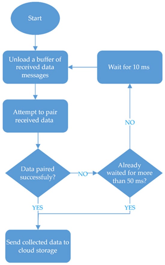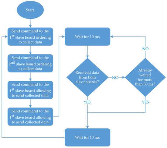 In this synchronization method, slave boards constantly collect and send data independently from the master board. The master board’s duties are reduced to just processing the incoming data. However, the data processing now also involves the timestamp-based pairing of incoming data, unlike in the proposed synchronization method, where data were paired based on messages arriving during the same data-acquisition cycle. The increased workload of the master does not outweigh the advantage of having slave and master boards operate asynchronously, allowing a more rapid data collection. A comparison of the proposed and the alternative methods of synchronization is provided in Table 2.