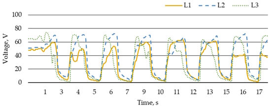 The experiment’s data were obtained from all sensors at a frequency of 24.6 samples per second. Data in the slave microcontrollers were not processed. This data set was transmitted to the master microcontroller through the local ad hoc Wi-Fi network. Each slave device was powered by a 3.6 V Li-Ion battery (Howell Energy Co., Ltd., Shenzhen, China). The supply voltage level was kept constant using an internal microcontroller stabilizer.