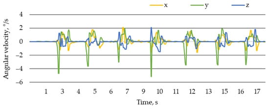 The data from the gyroscope were used to register changes in the orientation of the footwear in space along Cartesian axes (Figure 6). The values of the X and Y axes are negative at the beginning of the movement, which may suggest that the shoe was tilted forward and to the right. These values quickly return to zero, indicating the shoe’s return to its original position. The Z-axis values are positive at the beginning of the movement and then increase, which may suggest a shoe rotation around the vertical axis.