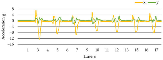 The accelerometer data show changes in the shoe’s speed along two axes (X, Y), as is shown in Figure 7. Based on these data, one can assume that at the beginning of the movement, the shoe’s speed along the X-axis (forward–backward) increases, which corresponds to the forward movement of the foot when climbing stairs. Then, the speed along the X-axis decreases, corresponding to a pause on the stairs. The accelerometer data provide foot orientation as well. Spatial orientation and orbit require further signal processing in the form of double integration with respect to time and proper phase angle definition from initial conditions.