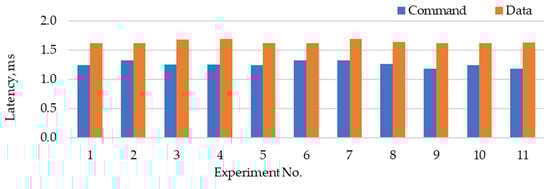 Actual latencies of the data-transmission process during experimental research are provided in Figure 8. As is seen from the graph, the latencies of the data transmission are not equal for each measurement. However, data-transmission latencies generally do not exceed 2 ms; therefore, such a system can run easily at a much higher operational speed. Fluctuations in latencies can be explained by adjustment of the internal slave microprocessor to the data-reading cycle and occupation of the CPU. The transmission of data distance was small, and its influence was neglected. In case of significant distances, they can affect the data-transmission rate. The transmission rate could also be affected by signal disturbance from other electromagnetic sources; therefore, data-transmission latency can be multiplied by several times. The transmission rate is evaluated in an intended practical experiment environment to determine whether the system retains the required transmission rate in its practical application. In case of an insufficient transmission rate, the required conditions of the experiment’s environment are revised (for example, the allowed distance between the human-body interface and the data-reception unit is lowered), or the network configuration and hardware are reassessed (for example, a router can be implemented as an intermediary device for communication).