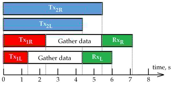 Intervals between queuing a message to be sent and the message being received: Tx1L—transmission of control command (ordering to gather data) to the left slave microcontroller, Tx1R—transmission of control command (ordering to gather data) to the right slave microcontroller; Tx2L—transmission of control command (allowing to send data) to the left slave microcontroller; Tx2R—transmission of control command (allowing to send data) to the right slave microcontroller; RxL—data message from the left slave microcontroller; RxR—data message from the left slave microcontroller.