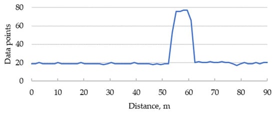 In an additional experiment determining the delay and stability of communication depending on distance and obstacles, several results were obtained that make it possible to understand how applicable this solution is in real gait analysis. Latency was measured in a long corridor at a distance of up to 90 m (Figure 10). Each data point in the graph indicates the communication delay, while the master microcontroller and slave microcontrollers were at an indicated distance from each other. We assume that movement was constant, and the displacement during one communication is negligible.