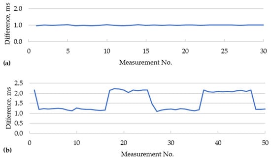 The difference in time of each slave board receiving a synchronization message: (a) using the proposed method of synchronization; (b) using the alternative method of synchronization.
