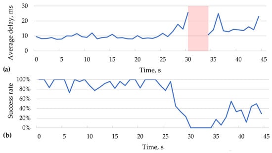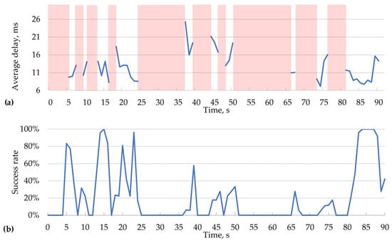 Measurement latency in an open field along a busy road: (a) average delay (red zone indicates a timeframe of 0% success rate); (b) success rate.