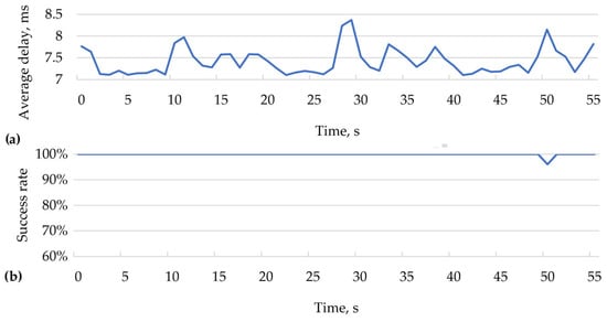 The delay and stability of communication were also evaluated by conducting an experiment in an open field along a busy road. The results of this experiment are presented in Figure 14. Brief drops in the success rate can be seen throughout the experiment. At an approximately 100 m distance, the connection success rate became equal to 0%, as indicated by a red zone in the average delay graph. The connection resumed shortly after, but the success rate did not rise back to prior values. Presumably, the communication failure and brief drops in signal reliability were caused by passing cars and the close presence of smart devices.
