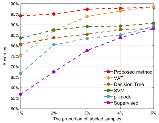 As shown in Figure 5 and Table 2, our proposed method achieves the best results with a labeled sample proportion of 1–4%. This indicates that semi-supervised learning methods based on pseudo-labeling and consistency regularization perform well in the AMC domain. We find that both semi-supervised learning methods (pi-model, VAT, proposed method) and machine learning methods (decision tree, support vector machine) have a higher classification accuracy than supervised learning methods when the number of labeled samples is small (1–5% of labeled samples). These supervised learning methods only use a backbone network for classification. This suggests that deep-learning-based methods are driven by data, and their classification accuracy is greatly affected in the case of insufficient data samples. The machine-learning-based method is not affected much by the number of data samples. However, it requires hand-designed features, which limits the improvement to the recognition accuracy. We found that the classification accuracy of both semi-supervised learning methods (VAT and Pi-model) is not good when the sample size is extremely small (1% of labeled samples). However, at this point, the recognition accuracy of our proposed semi-supervised method exceeds 94%. This suggests that our proposed method is suitable for scenarios where the number of labeled samples is extremely low. We find that the recognition accuracy of all methods increases as the sample size increases. This is because our proposed method learns the distribution of data not only in unlabelled data but also in labeled data. The greater the amount of labeled data, the more prior knowledge is gained. The recognition performance of the model is improved.