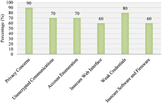 To comprehend the significance of IoT security, one can investigate the existing state of IoT devices that are currently in operation. It is reported that 80% of devices exposed users’ private information, such as name and date of birth, according to an assessment survey on commercialized IoT devices conducted by Hewlett-Packard (HP) []. The survey also found that 70% of the devices surveyed did not apply any encryption during communication, and 80% of them used fragile passwords in terms of adequate complexity and length. Moreover, of the devices, 60% had come with various security vulnerabilities, including cross-site scripting (XSS) [] in their interfaces. A summary of the survey findings is provided in Figure 1. A number of studies have demonstrated that it is possible to efficiently establish control over the operation of commercialized IoT devices and perform various illicit operations. Some of those findings are noted in Table 1.