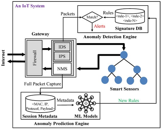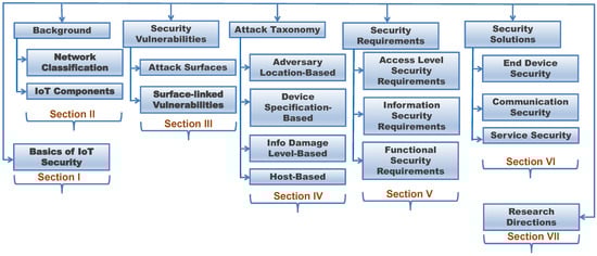 From a general viewpoint, some of the security and privacy issues in IoT have been discussed in [,,,,,]. However, these papers primarily survey IoT progress in general covering applications, enabling technologies, architectures, and some security fundamentals. Some of the IoT-related security concerns have been surveyed in Refs. [,] provides a survey on M2M research security, and [] discusses the challenges and solutions for securing fog computing for IoT applications. In regard to IoT-enabled cyberattacks, the authors in [] deliver an assessment survey on attack paths to relevant infrastructures and services. Ref. [] presents a reasonable review of intrusion detection systems for IoT technologies, but the paper mainly focuses on architecture types.
