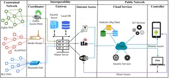 An IoT system comprises two types of networks: constrained network and public network. The smart devices operate in the constrained network. As shown in Figure 3, in a constrained network, the devices can use multiple protocols, such as 6LoWPAN [], Zigbee [], ZWave [], and BLE [], for communications. The communication links of a constrained network are low power and lossy. Therefore, smart devices exchange information between them at a rate which is significantly lower than conventional digital networks, such as Ethernet and WiFi. In the constrained network, smart devices use IPv6 for addressing and CoAP [] as the application protocol. In constrained networks, the RPL routing protocol [] is used to route network packets over the lossy links.